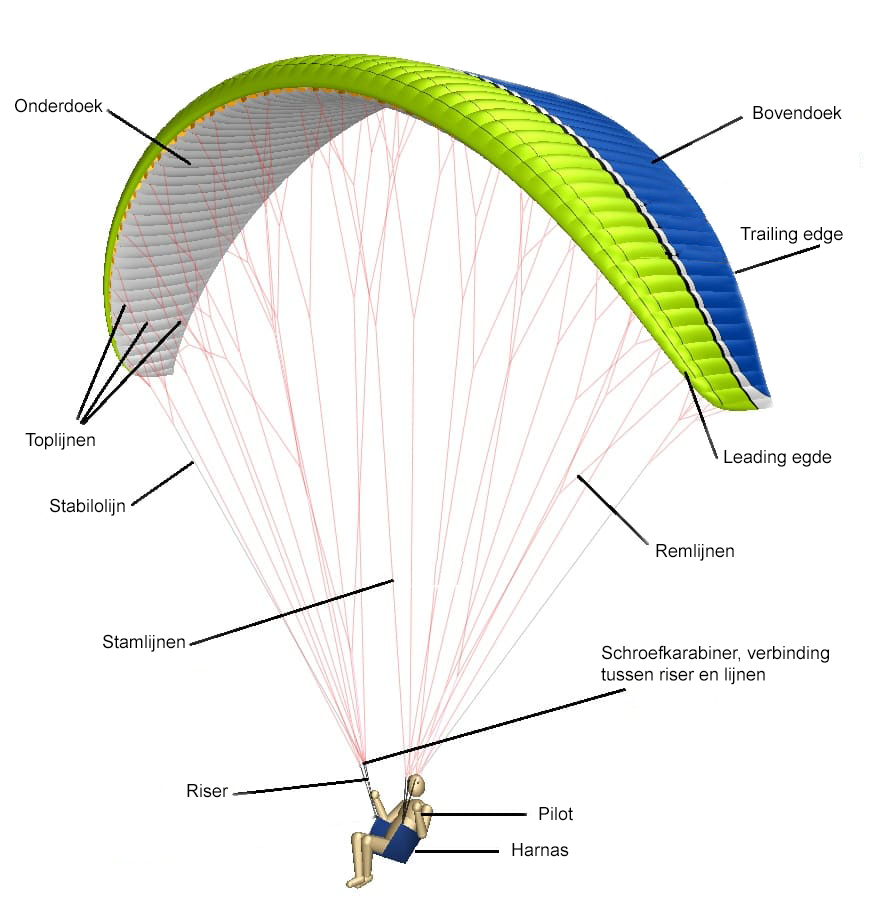 De paraglider bestaat uit twee delen stof, aan de boven- en onderzijde.Ze zijn met elkaar verbonden verbonden door bruggen, hierdoor wordt de vleugelvorm verkregen. Het materiaal is gemaakt van speciaal licht geweven nylondoek (polyamide). Het is geweven in een zogeheten ripstop-patroon waardoor de stof enorm sterk is en bij een klein scheurtje niet verder scheurt.